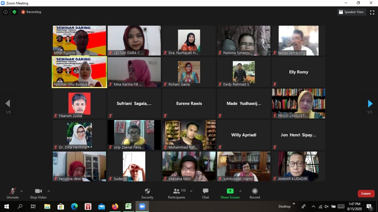 Analisadaily.com, Medan - Memperingati HUT ke-75 RI, Fakultas Ilmu Budaya Universitas Sumatera Utara (FIB USU) menggelar seminar daring bertema Kemerdekaan RI: Jembatan Emas Menuju Kesejahteraan Bangsa, Sabtu (15/8) sore.