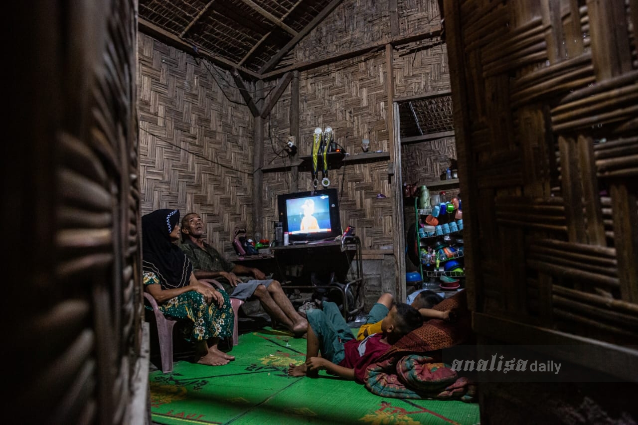 LISTRIK GRATIS PLN: Ayat (68) bersama istrinya Supiani (65), dan kedua cucu nya menikmati tayangan televisi saat rumah mereka sudah dialiri listrik gratis dari PLN di kawasan Langkat, Sumut, Selasa 28 Oktober 2025. Analisadaily.com/qodrat al qadri
