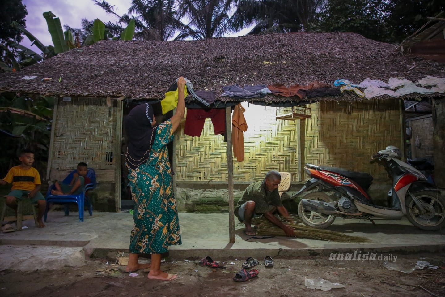 Hayat, (68) tengah memilih dan meraut daun kelapa sawit untuk dijadikan lidi, sementara Supiani (65) istrinya tengah mengangkat jemuran yang tampak kering sejak lepas asar, namun sengaja dibiarkan hingga jelang maghrib. Mereka menghidupi dua cucu yatim yang sejak empat tahun terakhir dirawat mereka. Tidak butuh waktu lama mencari kediaman Ayat, rumahnya mencolok dibanding rumah-rumah disekitar karena beratap rumbia, dan berdinding anyaman bambu