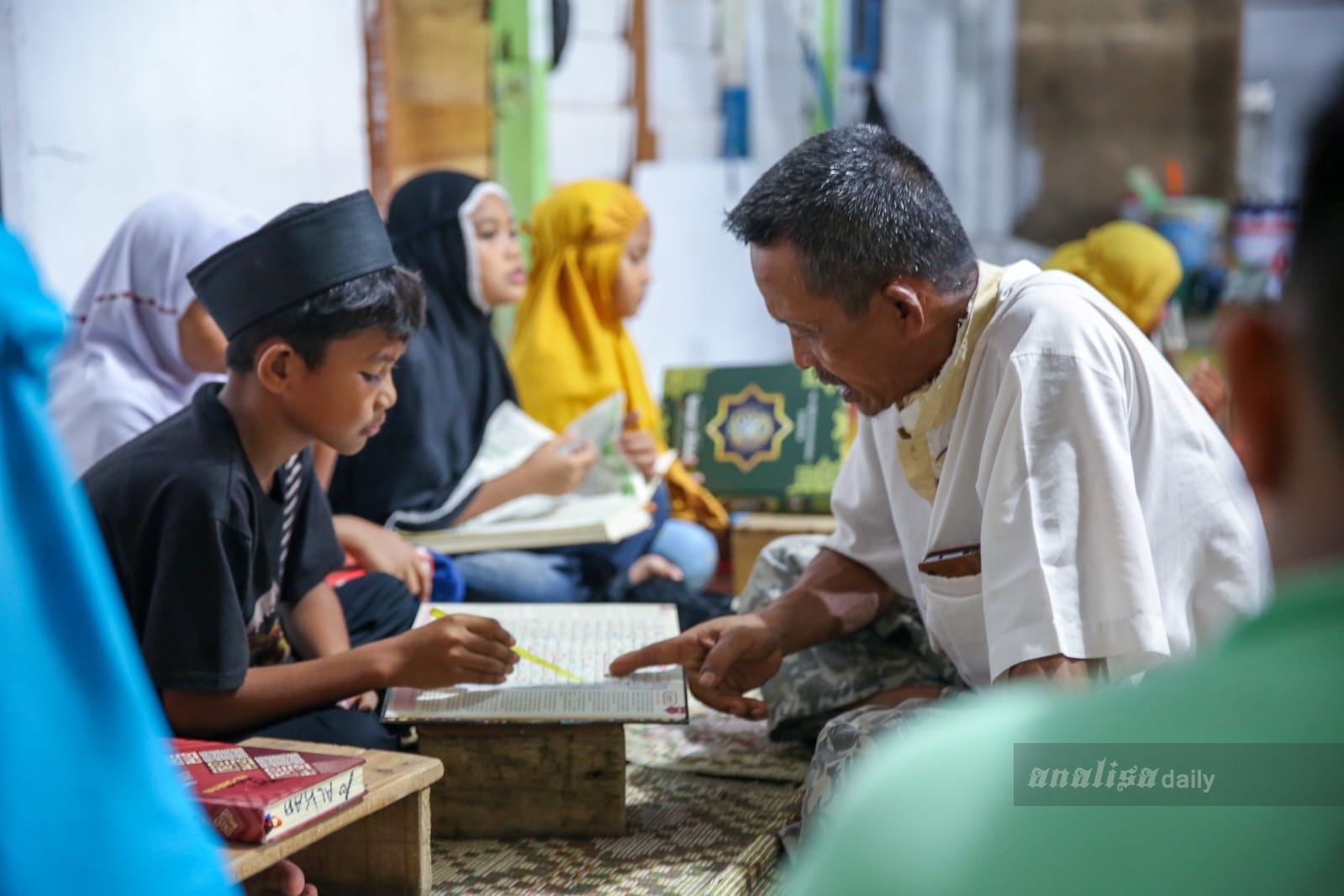 Anak-anak Kampung Nelayan berbagai usia dari anak hingga remaja mendapatkan pembelajaran ilmu hafal surah, dan koreksi bacaan oleh Burhanuddin. analisadaily/qodrat alqadri