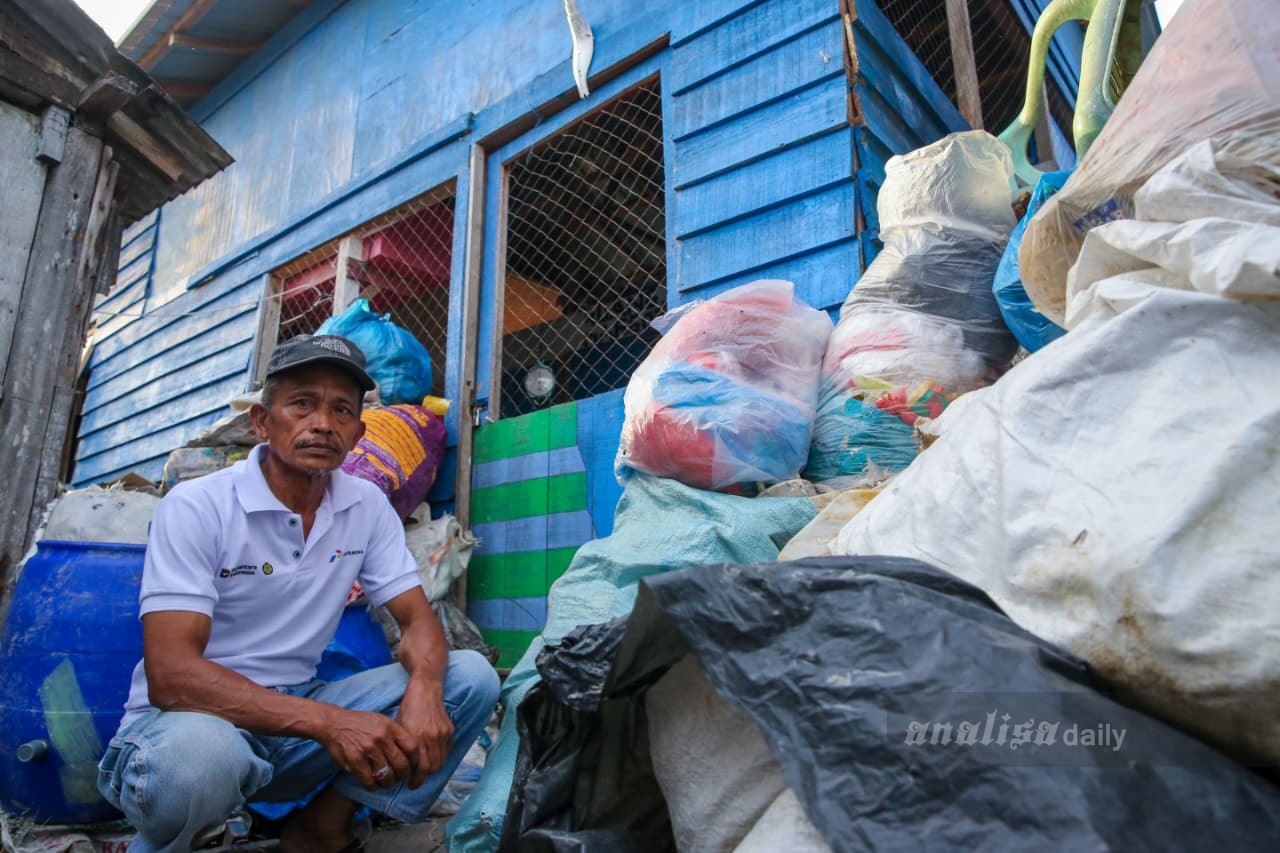 Burhanuddin berpose didekat tumpukkan sampah yang telah dikumpulkan, namun belum dipilah di Bank Sampah Horas Bah, Kampung Nelayan Seberang, Sumut, Minggu 26 Oktober 2025. analisadaily/qodrat alqadri