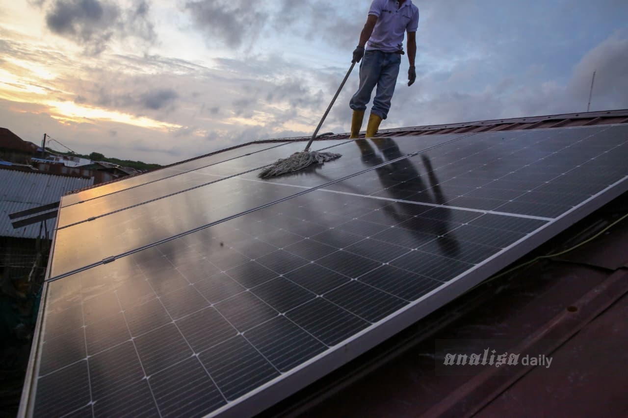 Burhanuddin saat membersihkan kotoran panel surya secara berkala yang ada di atas Bank Sampah Horas Bah. PLTS ini dihadirkan PT Pertamina untuk operasional bank sampah agar lebih produktif dan ekonomis Analisadaily/qodrat al qadri