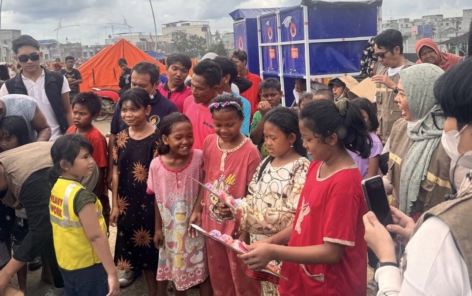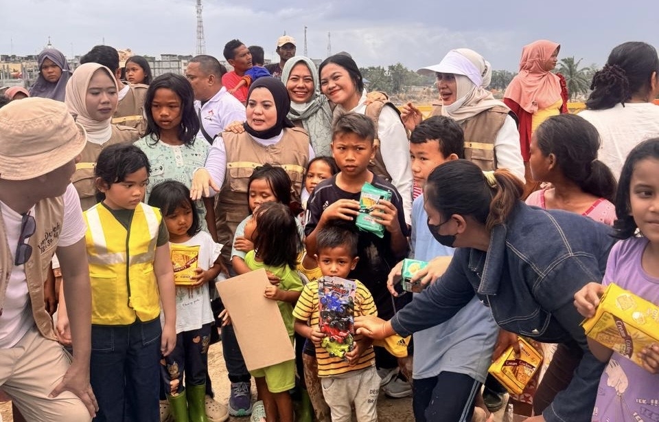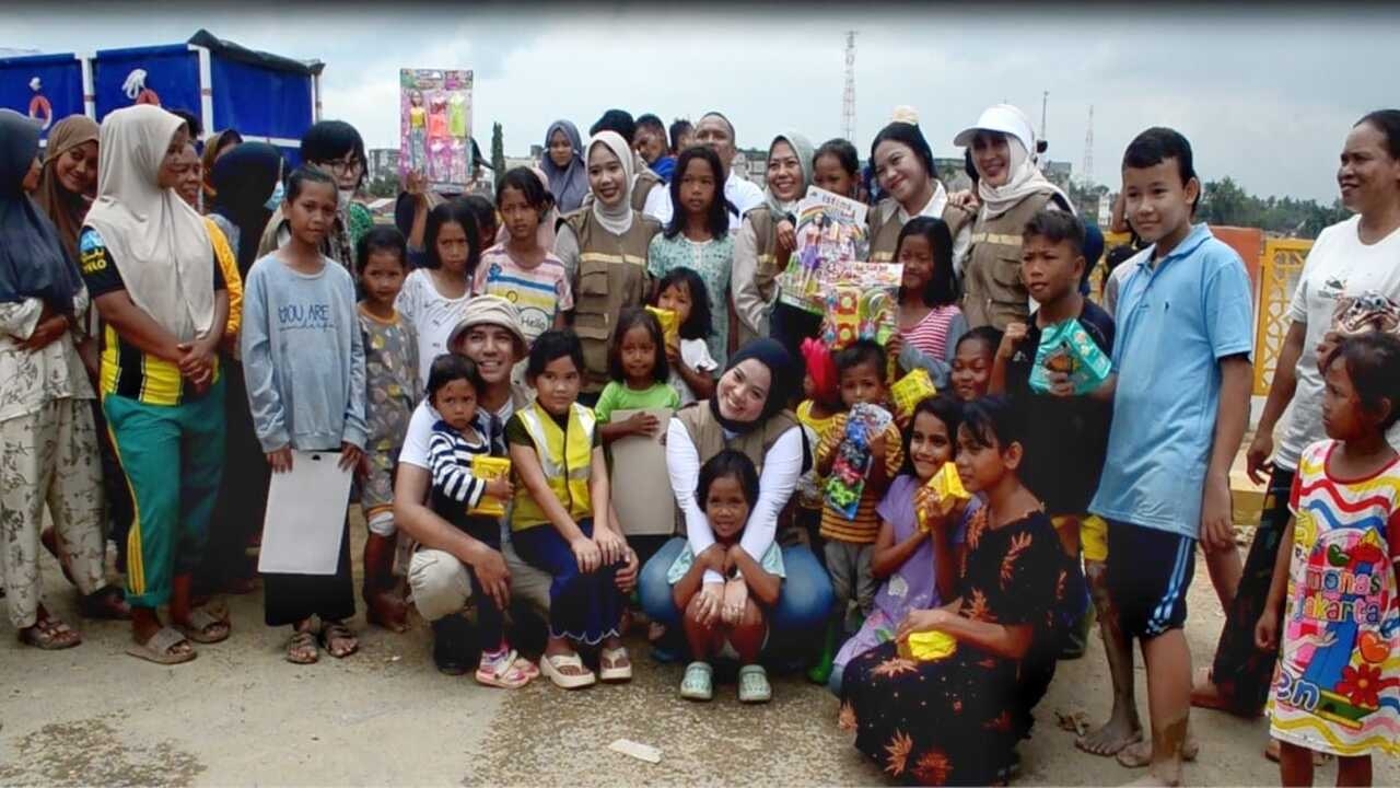 Bersama Tim Relawan Medan, misi kemanusiaan Ayunindya bukan sekadar datang dan melihat. Di atas Jembatan Kembar Aceh Tamiang, tepat di kawasan tenda pengungsian, ia turut menyerahkan ratusan mainan kepada anak-anak korban banjir.